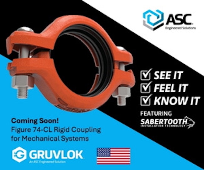 | | Sponsored | | A patent-pending Gruvlok® rigid coupling from ASC Engineered Solutions is on the way that could revolutionize mechanical piping system installations. The new Gruvlok Fig. 74-CL rigid coupling features brand new Sabertooth™ Installation Technology, allowing for quick and accurate visual and tactile installation verification. New CenterLok™ gasket available. See it. Feel it. Know it! |